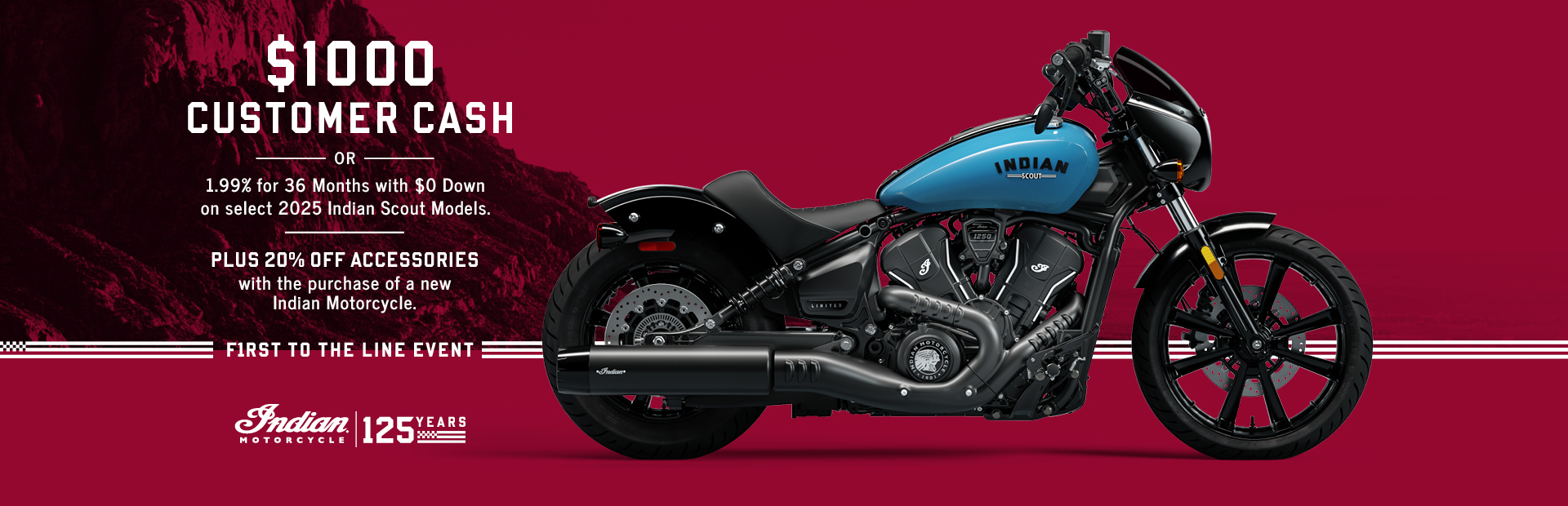 This is a limited time offer which is valid for the purchase of selected qualifying models and is subject to credit approval on qualified purchases financed during this program. Offer may be combined with certain other offers (specifically customer cash), is subject to change and may be extended or terminated without further notice. Offer valid on new MY24 FTR models, and MY25 Scout models (1250 and Scout Sixty – excludes Scout Bobber Sixty). Monthly payment and cost of borrowing will vary depending on amount borrowed and down payment/trade. Minimum financing amount varies, check with your Indian Motorcycle dealership for minimum financing details. Example: $30,999 financed at 1.99% APR over 36 months = 36 monthly payments of $799; financed amount of $27,899 with 10% down payment, total cost of borrowing of $864 and a total obligation of $28,763. An example of monthly payments required on a 36-month term at 1.99% APR is $28.64 per $1,000 financed. Monthly payment examples do not include taxes, title, and other fees. Offer only valid to qualified customers, not all customers will qualify, other offers available, see dealer for details. Excludes all Elite Models. Offer Valid: March 1 – 31, 2026.