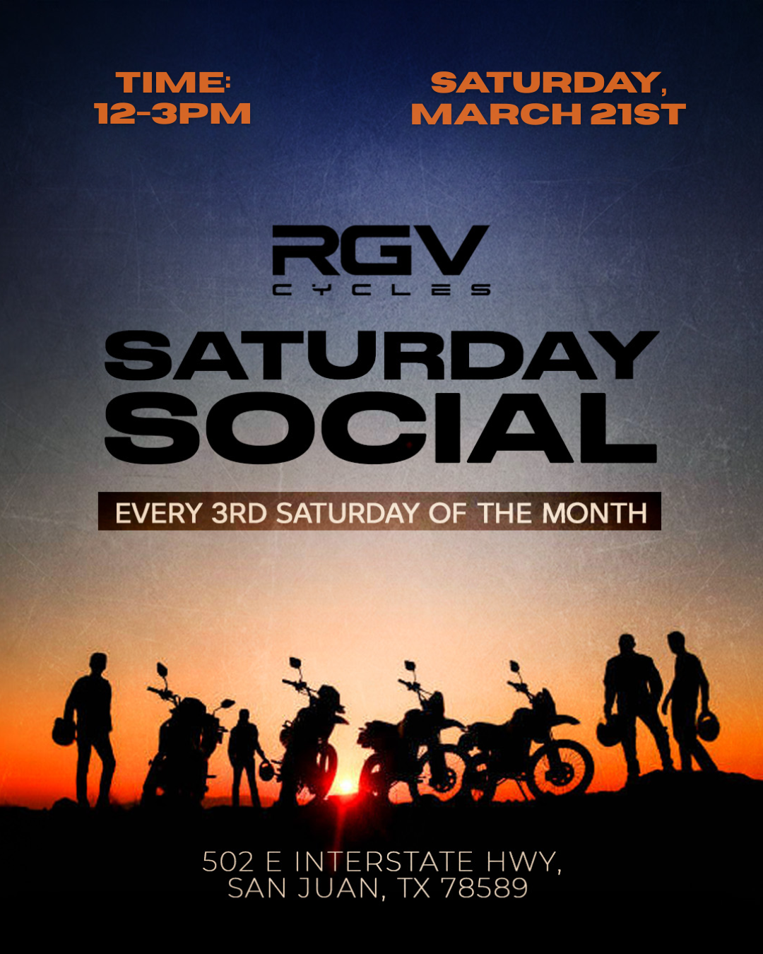 Be apart of RGV Cycles Saturday Social every 3rd Saturday of each month! A monthly meetup created to bring riders together, share stories, check out bikes, and strengthen our motorcycle community. Whether you ride BMW, Indian, Slingshot, or just love being around bikes and good people — this is your place. Event Details Date: Saturday,... [Read More]
